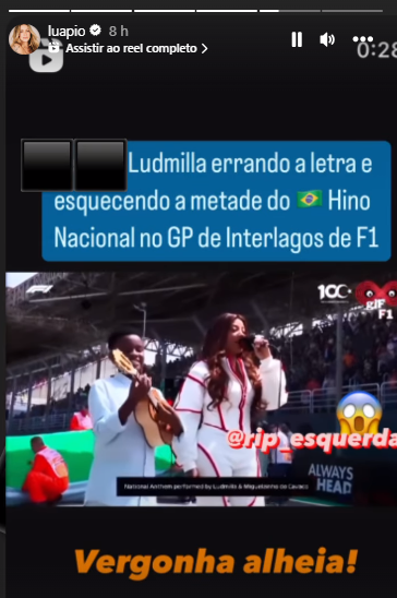 Luana Piovani ataca Ludmilla por apresentação do hino na F1: “Vergonha alheia”