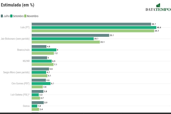 Na pesquisa estimulada, Lula tem 39,7% dos votos, representando uma leve queda na comparação com setembro, quando ele tinha 40,4%. Em julho, o ex-presidente tinha 38,7%.