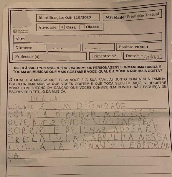 O trabalho escolar de uma criança de seis anos viralizou nas redes sociais por conter o jingle de campanha do presidente Lula. Na atividade, o professor pediu para que o aluno escrevesse a letra de uma música que despertasse emoções no aluno e em sua família.