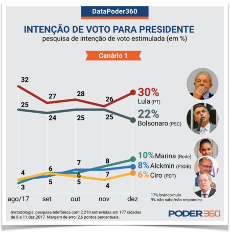 O Poder360 fez nova pesquisa eleitoral. Lula seria o vencedor no 1º e no 2º turnos, segundo levantamento realizado de 8 a 11 de dezembro.
