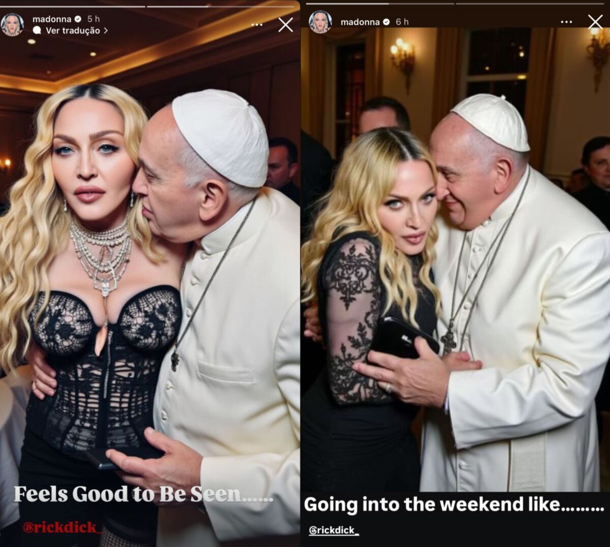 Na sexta-feira (13), Madonna surpreendeu seus seguidores ao compartilhar nos stories de seu perfil no Instagram duas montagens criadas com inteligência artificial em que aparece em clima romântico com o Papa Francisco. As imagens mostram a cantora e o pontífice em momentos fictícios de intimidade, criadas pelo artista Rick Dick, conhecido por suas montagens ousadas.