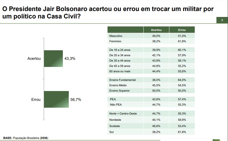 Um levantamento nacional realizado pelo Instituto Paraná Pesquisas e divulgado nesta segunda-feira (9) mostra que 56,7% dos brasileiros consideram que o presidente Jair Bolsonaro (sem partido) “errou” ao tirar “um militar” — no caso o general da reserva Luiz Eduardo Ramos — da Casa Civil para colocar no lugar “um político”.
