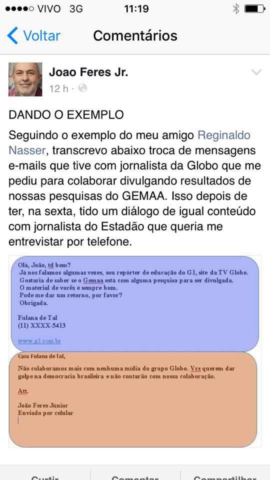 João Feres Jr., vice-diretor do Instituto de Estudos Sociais e Políticos da UERJ, por sua vez, transcreveu em seu Facebook a conversa com um jornalista do G1. “Isso depois de ter, na sexta, tido um diálogo de igual conteúdo com jornalista do Estadão que queria me entrevistar por telefone”, conta.