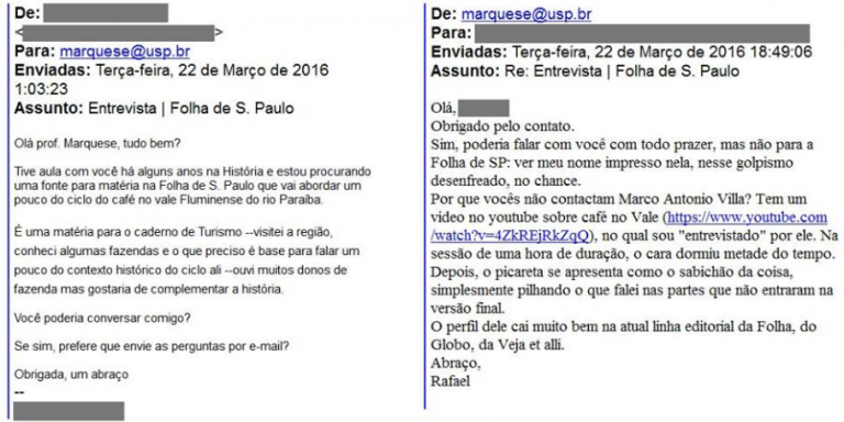 Mais dois professores publicaram sua recusa em participar de reportagens. Rafael Marquese, historiador da USP, não quis dar entrevista à Folha.