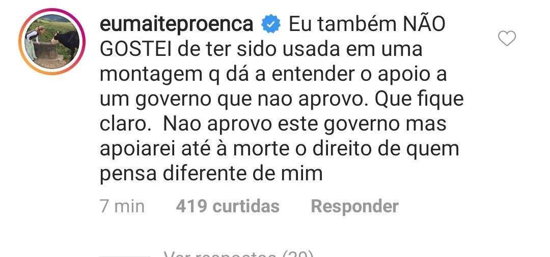 Maitê Proença também pede a Regina Duarte que retire sua foto: “Não aprovo este governo”