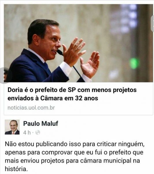 Maluf zoa Doria com relação ao recorde negativo de projetos na Câmara do prefeito de SP