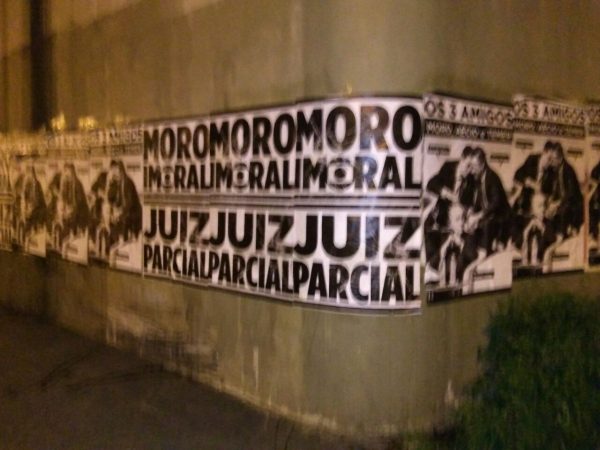 Belo Horizonte amanheceu hoje com cartazes como este espalhados pela cidade, com a mensagem: “Moro imoral, juiz parcial”. Outro cartaz tem o título Os Três Amigos, com a foto do magistrado na festa da revista Istoé em 2016, cochichando com Aécio, ambos sentados um patamar acima de Michel Temer. A letra O tem o logo da Globo. O grupo, que se autodenomina combatentes contra o fascismo, também preparou outro material, que pretende espalhar pela capital mineira, em que Moro aparece com o bigodinho de Hitler. “Se a Globo não mostra quem eles são, nós vamos mostrar”, diz um manifestantes que, por razões óbvias, não quer se identificar. “Até o dia 24 de janeiro (data do julgamento de Lula em segunda instância), nós vamos publicar muito mais material”, afirma. “A tela é deles, o muro é nosso”, acrescenta.