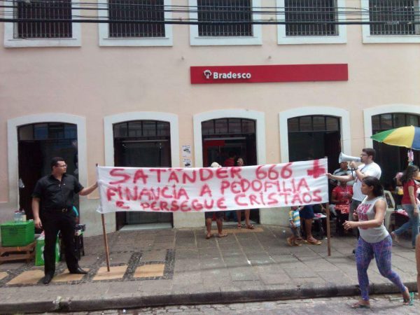 Viraliza a foto de grupos supostamente evangélicos que foram protestar contra o Santander na frente do Bradesco: “Alguém avisa que eles estão na frente do banco errado”.