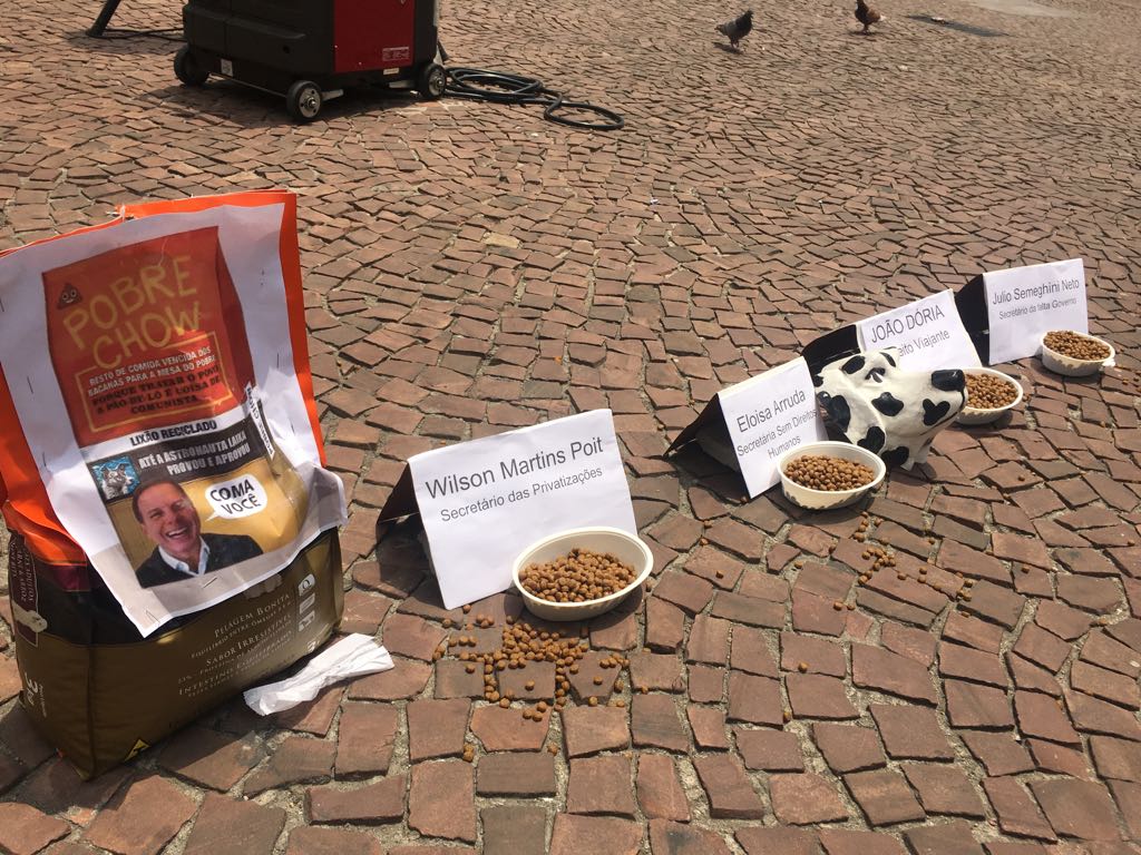 Eles levaram ração de cachorro e a colocaram em pratos com os nomes de Doria e alguns de seus secretários, como Eloisa Arruda (Direitos Humanos), Wilson Martins Poit, (Desestatização e Parcerias), e Julio Semeghini Neto (secretário de Governo).