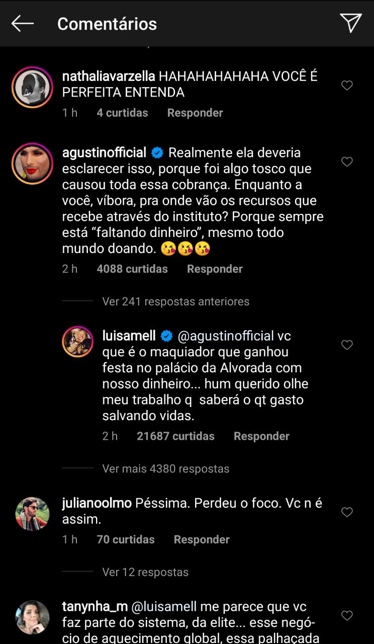 Após Luisa Mell questionar Michelle Bolsonaro sobre por que Fabrício Queiroz depositou R$ 89 mil na conta da primeira-dama, o maquiador Agustin Fernandez saiu em defesa da melhor-amiga e levou uma invertida da ativista da causa animal.