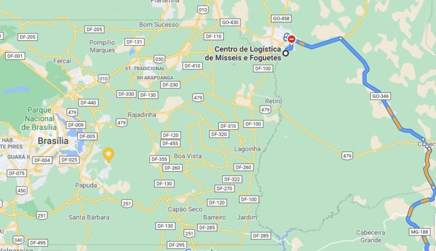 Pela rota estabelecida pelo Google Maps, ferramenta de GPS, o comboio com veículos blindados, armamentos e outros meios da Força de Fuzileiros da Esquadra não passaria nem perto de Brasília.