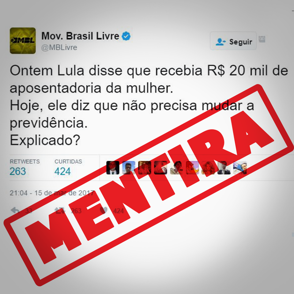 O Movimento Brasil Livre (MBL), divulgou ontem mais uma mentira em suas redes sociais. Dessa vez, a falsidade foi dita a respeito de Dona Marisa Letícia. O ex-presidente não disse que recebe R$ 20 mil de aposentadoria de sua mulher. Pior que isso, Dona Marisa não recebia uma aposentadoria de R$ 20 mil. O ex-presidente realmente afirmou foi que recebe R$ 6 mil de aposentadoria como anistiado político (não recebe nenhuma aposentadoria pelo acidente de trabalho onde perdeu o dedo) e R$ 20 mil mensais da LILS, sua empresa de palestras.
