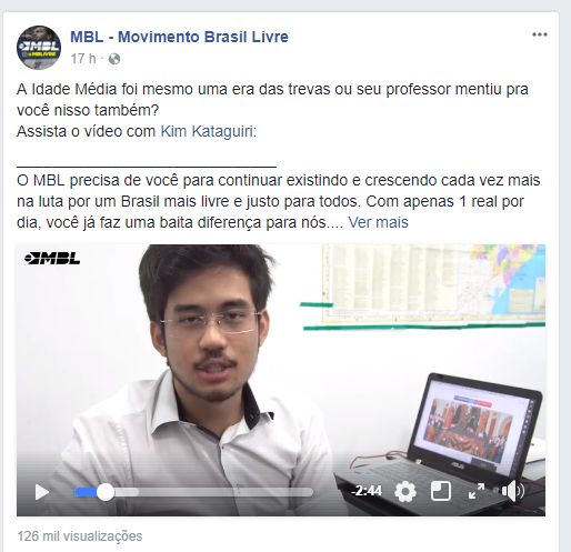Kim Kataguiri, o líder maluco do MBL, gravou um vídeo, acredite se quiser, defendendo a Idade Média no Facebook.