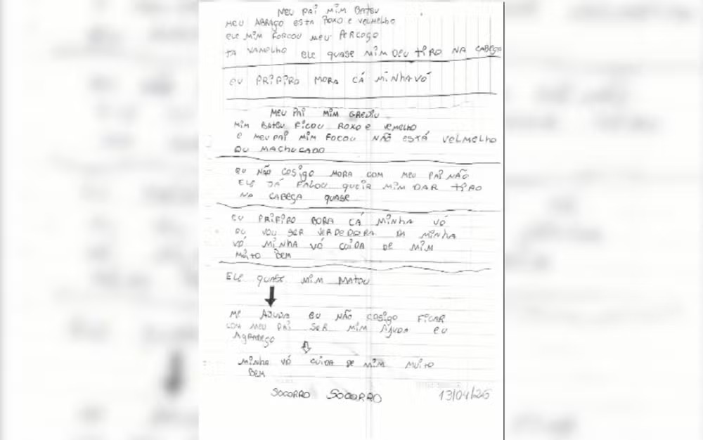 O bilhete foi feito na segunda-feira (13) e descreve episódios de violência. “Meu pai me bateu […] Ele me enforcou no pescoço, está vermelho e ele quase me deu um tiro”, relatou. O caso foi denunciado na terça-feira (14). Segundo a apuração, o pai foi preso por porte e posse ilegal de arma de fogo e admitiu as agressões. O nome dele não foi divulgado, e a defesa não foi localizada.