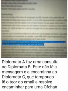 O diplomata enviou a mensagem, repassada a terceiros, que se indignaram. Dentro do Itamaraty, o que se diz é que o “escravo” seria um oficial de chancelaria. Na verdade, uma oficial de chancelaria que trabalha com a ministra a quem o embaixador recorreu. Ela teria ficado muito abalada com o tratamento desrespeitoso.