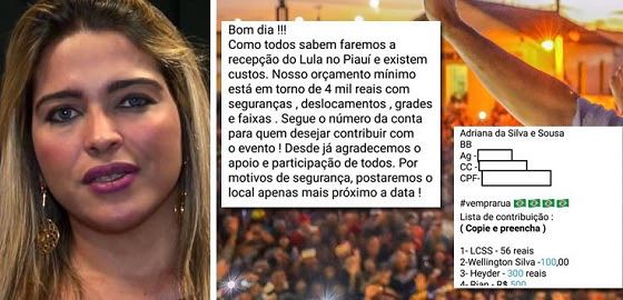 Segundo ele, a médica Adriana Sousa está com uma conta bancária aberta para receber recursos para realizarem manifestações agressivas contra a visita de Lula ao Piauí. O vereador, que é da executiva do PT, disse que o ex-presidente do Brasil não vai se intimidar e continuará viajando no estado piauiense.