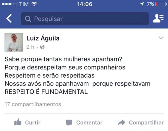 O cardiologista Luiz Antônio Rodrigues Águila, de 63 anos, causou profunda revolta ao postar, em seu perfil no Facebook, uma afirmação de cunho machista. “Sabe porque (sic) tantas mulheres apanham? Porque desrespeitam seus companheiros. Respeitem e serão respeitadas. Nossas avós não apanhavam porque respeitavam. Respeito é fundamental”, escreveu.