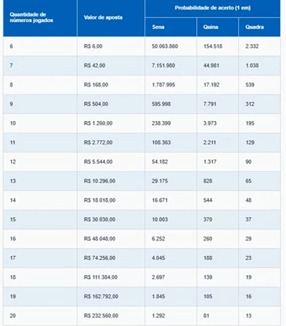 As chances variam conforme a quantidade de números escolhidos. Na aposta mínima, a probabilidade de acertar as seis dezenas é de uma em mais de 50 milhões. Com 20 números, o custo chega a R$ 232.560, e a chance sobe para uma em 1.292.