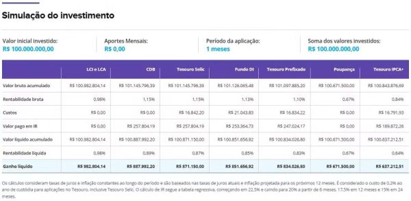 Na simulação, o ganhador teria a opção de escolher entre diversas modalidades de investimento, sendo que a rentabilidade líquida pode variar de acordo com o tempo de aplicação e o tipo de produto. A rentabilidade de LCI, LCA e a Poupança, por exemplo, são isentas de Imposto de Renda, o que favorece ainda mais a escolha desses produtos.