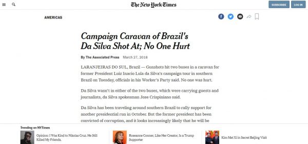 O jornal The New York Times também deu destaque e comentou sobre o atentado a tiros sofrido contra ônibus da caravana do ex-presidente Lula, destacando que o ônibus da caravana teria sido alvejado na passagem de Quedas do Iguaçu para Laranjeiras do Sul. Que os passageiros do ônibus ouviram durante o trajeto o som das balas e que uma perícia e investigação irão averiguar o fato.