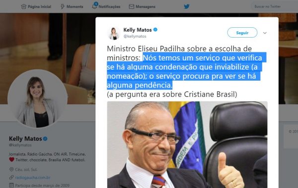 A jornalista Kelly Matos da Rádio Gaúcha perguntou ao ministro Eliseu Padilha sobre as pendências jurídicas de Cristiane Brasil, que o governo quer na pasta do Trabalho. Recebeu a seguinte resposta: