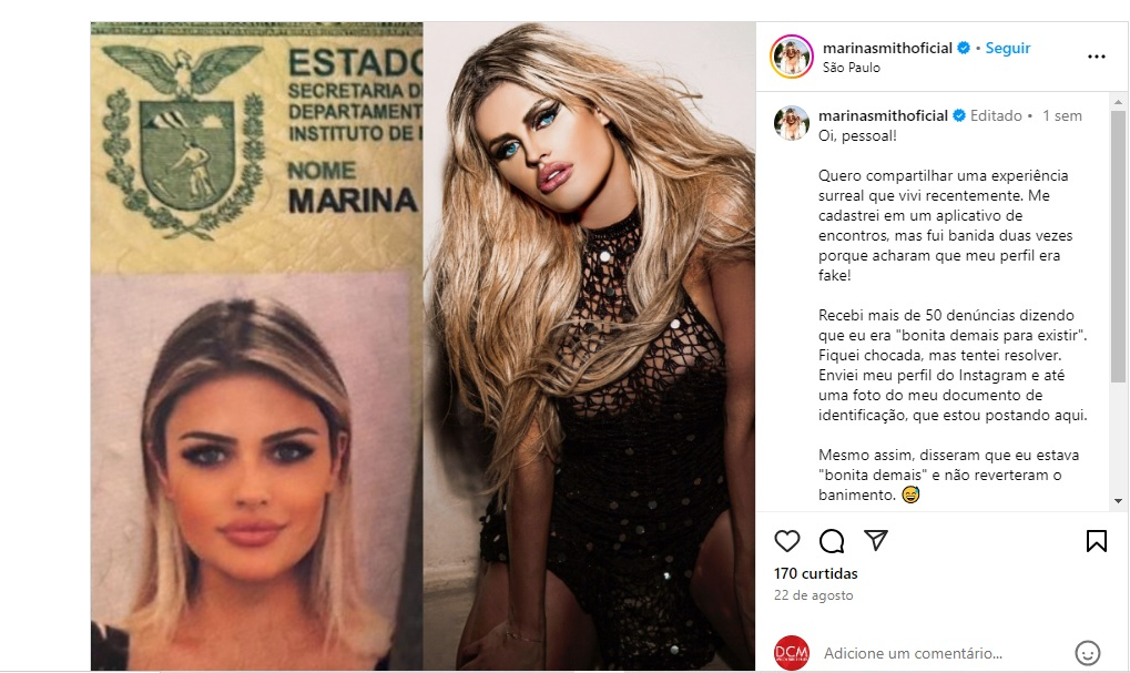 “Recebi mais de 50 denúncias dizendo que eu era ‘bonita demais para existir’. Fiquei chocada, mas tentei resolver. Enviei meu perfil do Instagram e até uma foto do meu documento de identificação, que estou postando aqui. Mesmo assim, disseram que eu estava ‘bonita demais’ e não reverteram o banimento”, disse Marina.