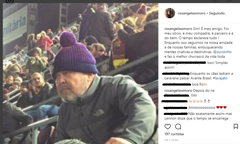 “Sim! É meu amigo. Foi meu sócio, é meu compadre, é parceiro e é do bem. O tempo esclarece tudo! Enquanto isso seguimos na nossa amizade e de nossas famílias, enlouquecendo mentes criativas e destrutivas. @zucolotto e faz o melhor churrasco da vida toda”, escreveu Rosangela Moro.