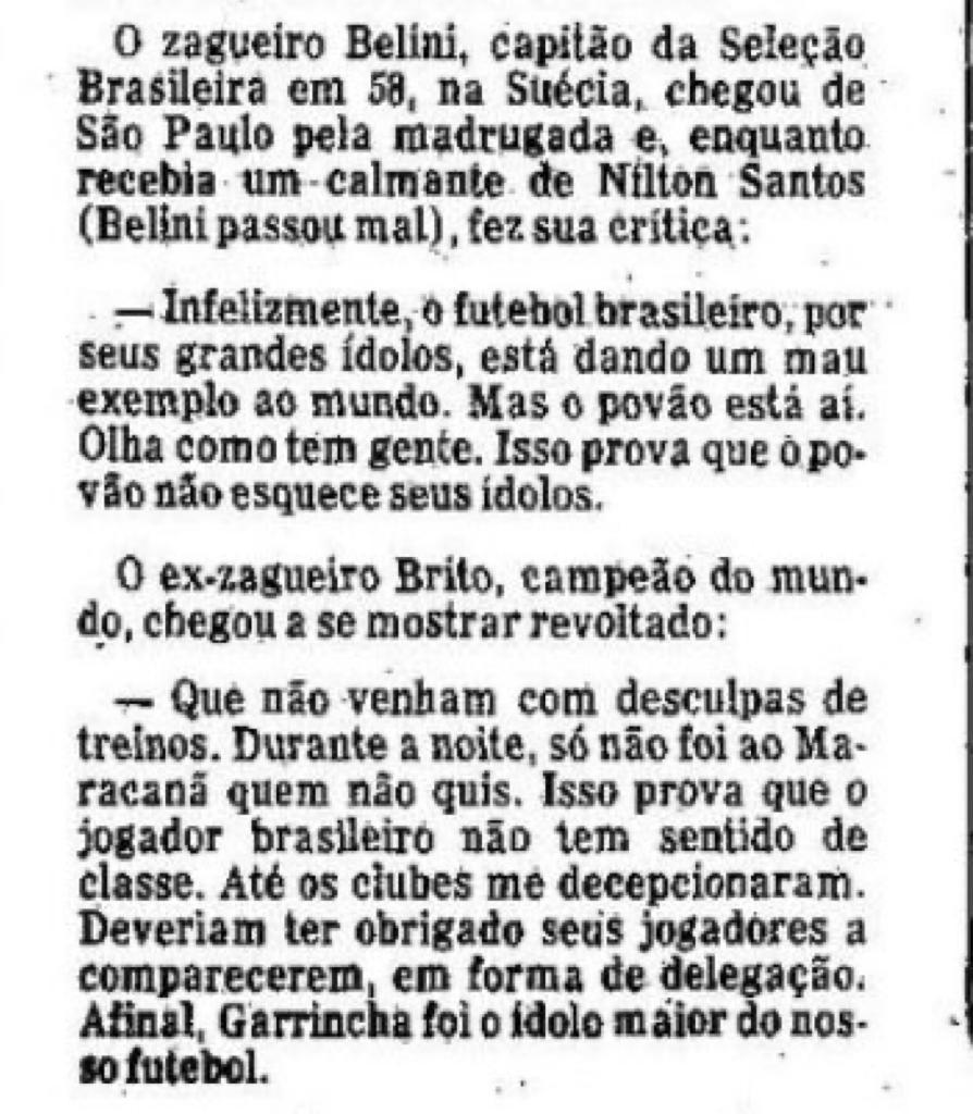 Tal qual como ocorreu com o Rei do Futebol, em 1983 o velório de Mané Garrincha também teve desfalques dos jogadores da época. O zagueiro Hilderaldo Luís Bellini, que foi capitão da seleção na primeira vitória do Brasil em uma Copa do Mundo, em 1958, na Suécia, chegou a dizer que o futebol brasileiro e seus grandes ídolos estavam dando um “mau exemplo ao mundo” por não comparecer à cerimônia de despedida de Garrincha, que ocorreu no estádio Maracanã, no Rio de Janeiro. O recorte da matéria da época foi resgatado pelo perfil @futebolchevique, no Instagram: