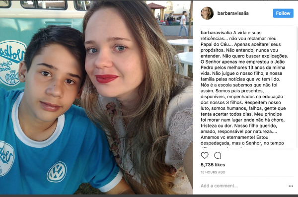 No sábado, Barbara Melo, a mãe do menino João Pedro Calembo, de 13 anos fez homenagem ao filho no Instagram: