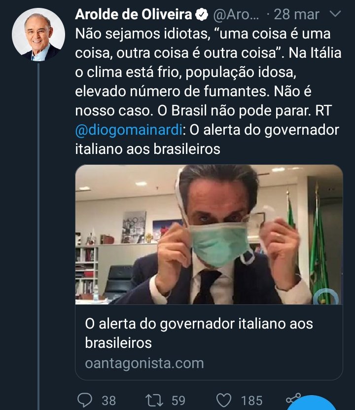 ‘Não sejamos idiotas, “uma coisa é uma coisa, outra coisa é outra coisa”. Na Itália o clima está frio, população idosa, elevado número de fumantes. Não é nosso caso. O Brasil não pode parar’, escreveu Arolde.