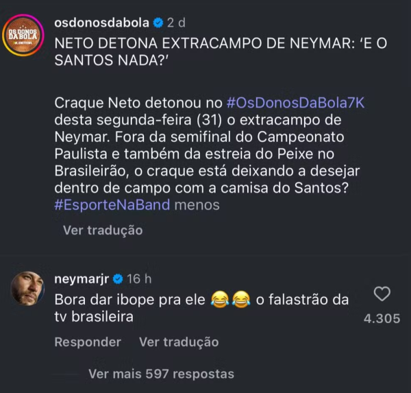Fora dos gramados há um mês, Neymar usou as redes sociais para responder a uma crítica do apresentador e ex-jogador Craque Neto sobre suas atitudes extracampo durante a recuperação de uma lesão. O camisa 10 do Santos comentou um vídeo do perfil “Os Donos da Bola”, no Instagram, dizendo: “Bora dar ibope pra ele, o falastrão da TV brasileira”.