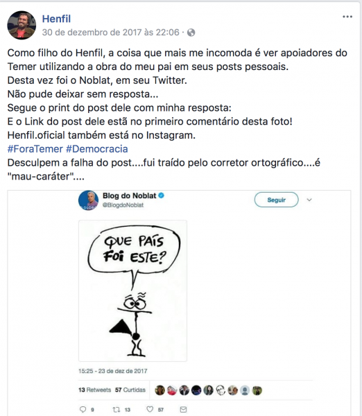 No Facebook, Ivan postou a imagem e acrescentou: “Como filho do Henfil, a coisa que mais me incomoda é ver apoiadores do Temer utilizando a obra do meu pai em seus posts pessoais. Desta vez foi o Noblat, em seu Twitter. Não pude deixar sem resposta”.