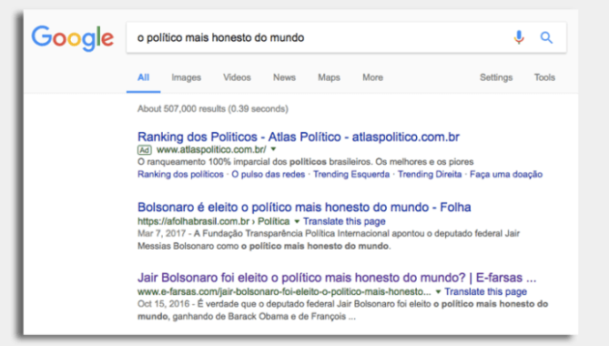 A notícia falsa de que o deputado Jair Bolsonaro (PSC-RJ) teria sido eleito “o político mais honesto do mundo” deixará de receber destaque na primeira página da busca do Google.