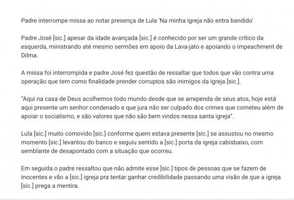 O ex-presidente Luiz Inácio Lula da Silva segue como um dos alvos preferidos dos criadores de boatos da internet brasileira. Depois de duas notícias falsas sobre agressões ao petista em restaurantes, ambas desmentidas pelo Me engana que eu posto (leia aqui e aqui), os especialistas em propagar mentiras online inovaram. O cenário da mais recente lorota do gênero envolvendo Lula é uma igreja e o responsável por desancá-lo publicamente teria sido um padre. “Padre interrompe missa ao notar presença de Lula ‘Na minha igreja não entra bandido’”, é o título do boato.