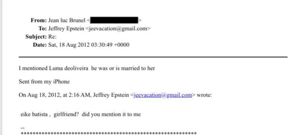 Em uma das trocas, o empresário americano pergunta a Brunel: “E a namorada do Eike Batista? Você chegou a comentar isso comigo”. O francês responde: “Eu mencionei a Luma de Oliveira; ele era ou é casado com ela”, em referência ao empresário Eike Batista. O conteúdo não indica contato direto com a modelo, apenas menção nominal.