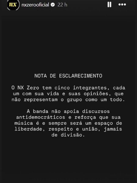 Diante da repercussão, o grupo publicou um comunicado oficial afirmando que cada integrante “tem sua vida e suas opiniões, que não representam o grupo como um todo”. Caco Grandino integra o NX Zero desde 2006 e participou da fase mais popular da banda, formada em 2001 e marcada por sucessos como “Cedo ou Tarde” e “Razões e Emoções”.