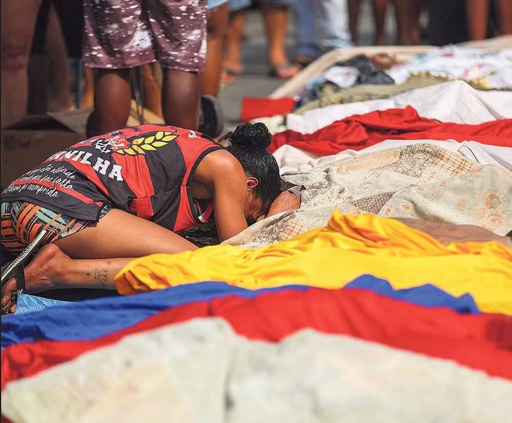 Parentes e amigos choraram seus mortos na Praça São Lucas, no Complexo da Penha, após a chacina policial que deixou 121 vítimas fatais. A cena de corpos enfileirados em frente a uma creche revelou o drama humano por trás da ação considerada a mais letal da história do estado do Rio de Janeiro. Mulheres foram predominantes entre os que prestavam homenagem e tentavam identificar familiares.
