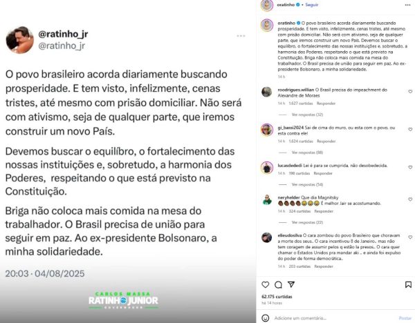 No campo das celebridades, a única manifestação pública veio do apresentador Ratinho. A fala de apoio não foi direta: ele apenas compartilhou em sua rede social uma publicação feita pelo governador do Paraná, Ratinho Júnior (PSD), seu filho.