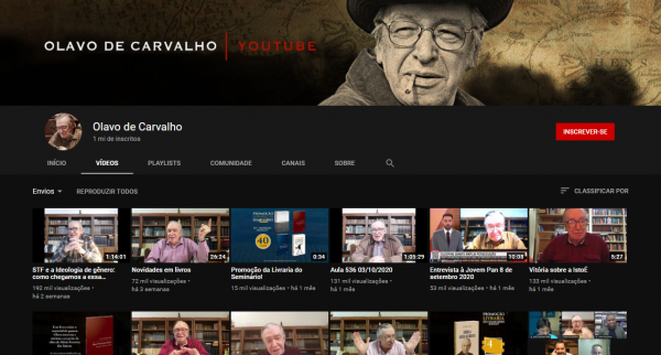 “Já não consigo mais publicar vídeos na minha página do Youtube. Estou sob intervenção da censura”, escreveu Olavo.