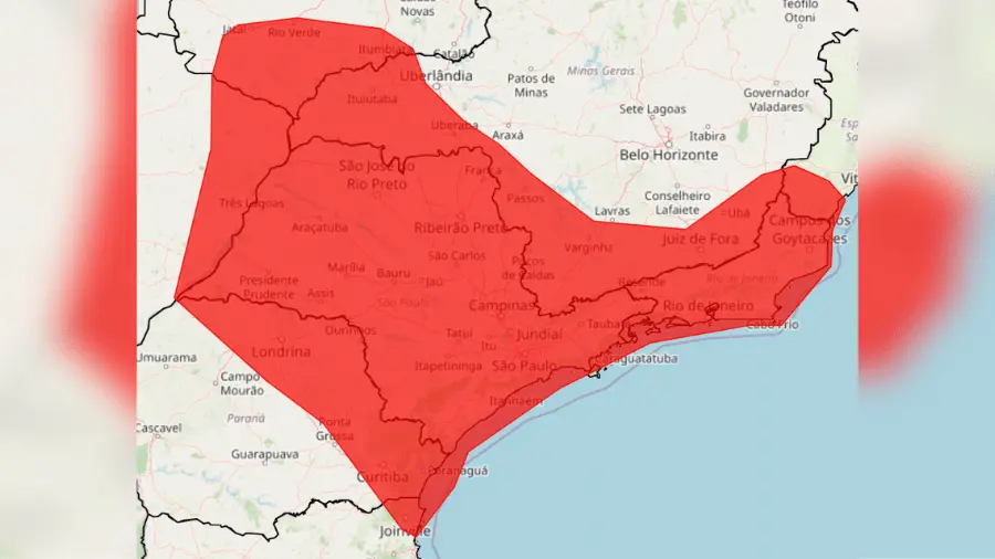 O alerta inclui Espírito Santo, Rio de Janeiro, São Paulo, Minas Gerais, Goiás, Mato Grosso do Sul, Paraná e Santa Catarina. No Paraná, a área afetada abrange o norte do estado, incluindo Londrina e Curitiba. Em Minas Gerais, o sul do estado está no radar, com cidades como Uberaba, Varginha e Juiz de Fora. Também estão sob risco o leste de Mato Grosso do Sul, incluindo Três Lagoas, e o sul do Espírito Santo, na região de Cachoeiro de Itapemirim.