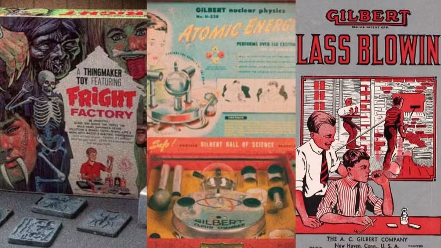 - Laboratório de Energia Atômica Gilbert U-238 (1949): incluía amostras reais de urânio e contador Geiger, expondo crianças a materiais radioativos dentro de casa.