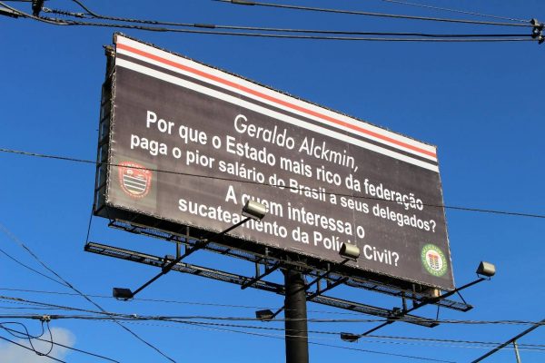 No outdoor se lê: “Geraldo Alckmin, por que o estado mais rico da federação paga o pior salário do Brasil a seus delegados? A quem interessa o sucateamento da Polícia Civil?”.