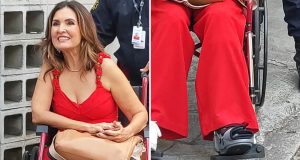 Fátima Bernardes chega de cadeira de rodas para gravação na Globo