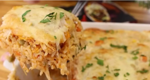 Arroz de forno cremoso com frango desfiado para o almoço de domingo