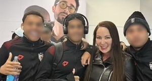 Jogadores da base do Atlético-GO posam para foto ao lado de atriz pornô