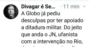 Entusiasmada com a intervenção, Globo vai pedir desculpas por ter pedido desculpas pelo apoio à ditadura