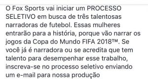 Canal Fox Sports abre processo para contratar narradora de futebol “talentosa” e pede “foto de corpo e de rosto”