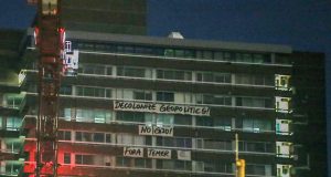 Faixa “Fora Temer” é estendida em edifício de Hamburgo, sede do G-20