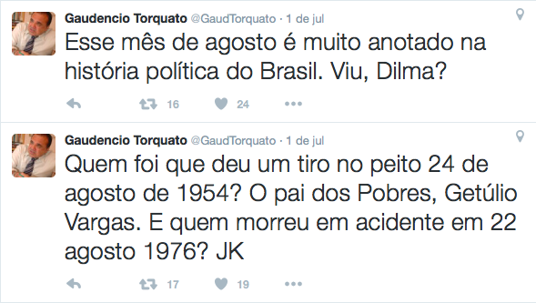 Conselheiro de Temer diz para Dilma que, em agosto, Getúlio ‘deu um tiro no peito’ e ‘JK morreu em acidente’