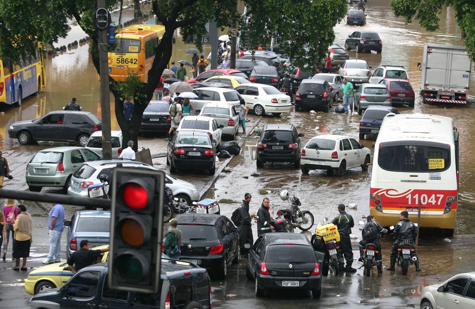 Motoristas parados por causa de alagamento monstruoso no Rio sofrem arrastão